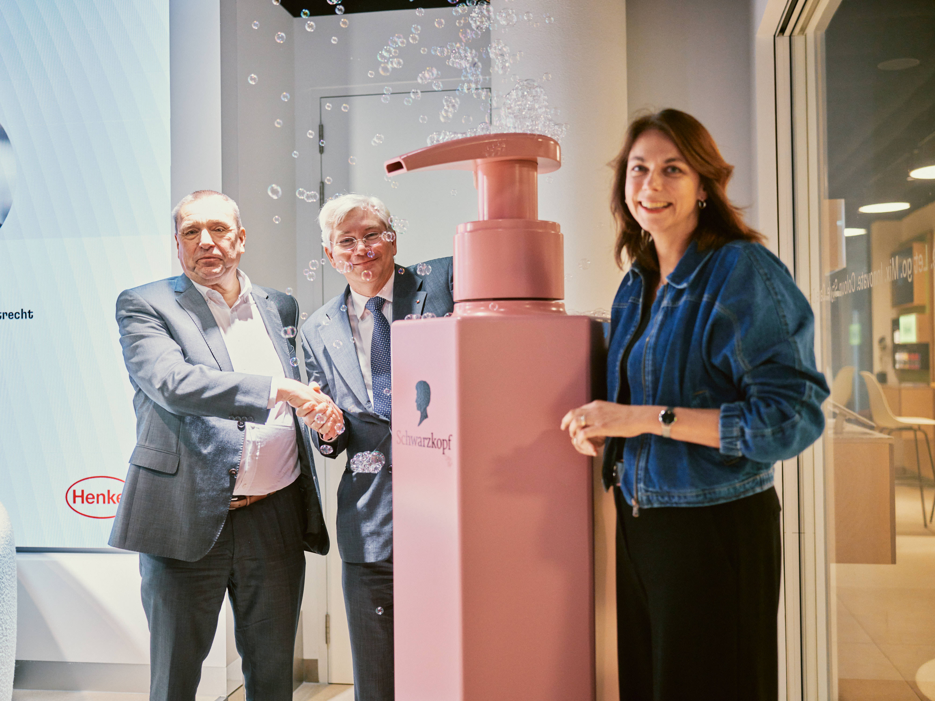 Op de foto Geert Luyckx (President Henkel Benelux), André van Schie (Gedeputeerde Provincie Utrecht) en Liesbeth van Dijk (General Manager Henkel Consumer Brands Professional) - Foto: Henkel
